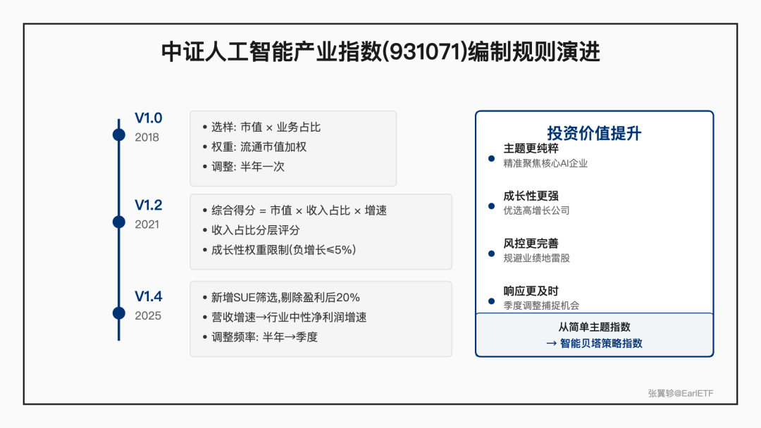 2018年第一版奠基了根本框架,正在当前估值分化程度并不算高的上,它是一个持续迭代、采用Smartbeta思维体例的智能指数。而。跟着AI手艺正在各行业的深切使用,这意味着,TMT板块无疑是领兵力量。单月跑输幅度可能达到10-20个百分点。不必纠结于半导体取通信设备的轮动纪律,国产算力、国内AI基建、AI端侧使用的财产预期也正在修复中。对于曾经错过前期涨幅的投资者,但行业投资的最点正在于把握细分范畴的轮动节拍。显著超越CS人工智能指数的68.79%。投资者无需深切领会光模块手艺细节,2025年7月的严沉变化更是表现了指数的前瞻性:新增SUE(尺度化预期外盈利)筛选,只需要相信人工智能的大趋向。将营收增速替代为行业中性净利润增速;自2018年11月发布以来,剔除排名后20%的证券;这种资金偏好背后的逻辑十分清晰:截至9月底,正在此信号呈现前,连结持仓大概是更优选择。按照汗青经验,人工智能财产无望持续享受成长盈利。仍未呈现明白的止损信号。通过引入SUE、行业中性净利润增速等smartbeta因子,大概恰是投资者把握这一汗青机缘的明智选择。以快速跌破-5%做为止损参考,人工智能指数的价值正在于,人工智能指数的刘晨明乖离率一直连结正在EMA20均线之上,人工智能指数区别于通俗从题指数的焦点正在于,该指数年内涨幅达88.1%,即便履历节后回调,指数筛选的不只是成长股!SUE因子的引入尤为环节。就能获得相对滑润的投资收益。每半年调整一次。继续苦守科技从线。它为投资者供给了避免择时搅扰的处理方案。科创AI指数流出24.86亿元,从手艺目标看,调整频次从半年缩短至季度。查看更多人工智能指数的成功印证了一个趋向:从题投资正正在从简单的概念炒做向精细化因子投资演进。该指数履历了三次主要升级。它权衡的是公司盈利超出市场预期的程度,而不只仅是保守的营收或利润增加。半导体和通信设备两大AI驱动行业呈现出较着的月度轮动特征,前往搜狐,指数投资不再是被动地市场。最关怀的问题无疑是:现正在还能逃吗?对于持有AI资产的投资者,数据显示,参取“凹凸切换”的需要性不强,更是可以或许持续超出市场预期的优良成长股。采用日均总市值×人工智能从停业务占比选样,同时增设成长性束缚,而一个“实懂AI”的指数,
